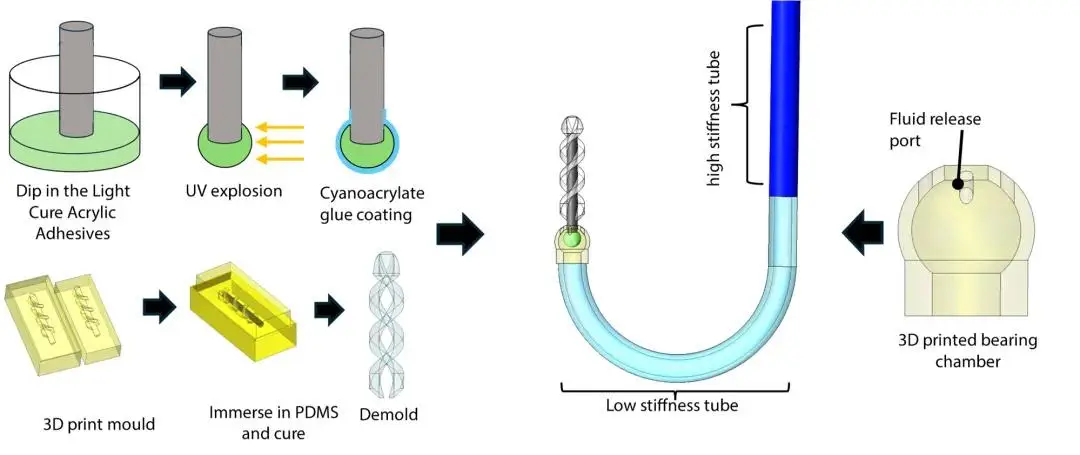 图:亚毫米级磁控微导管的加工方法,导管头部的模具是由摩方微纳3D打印技术制备而成