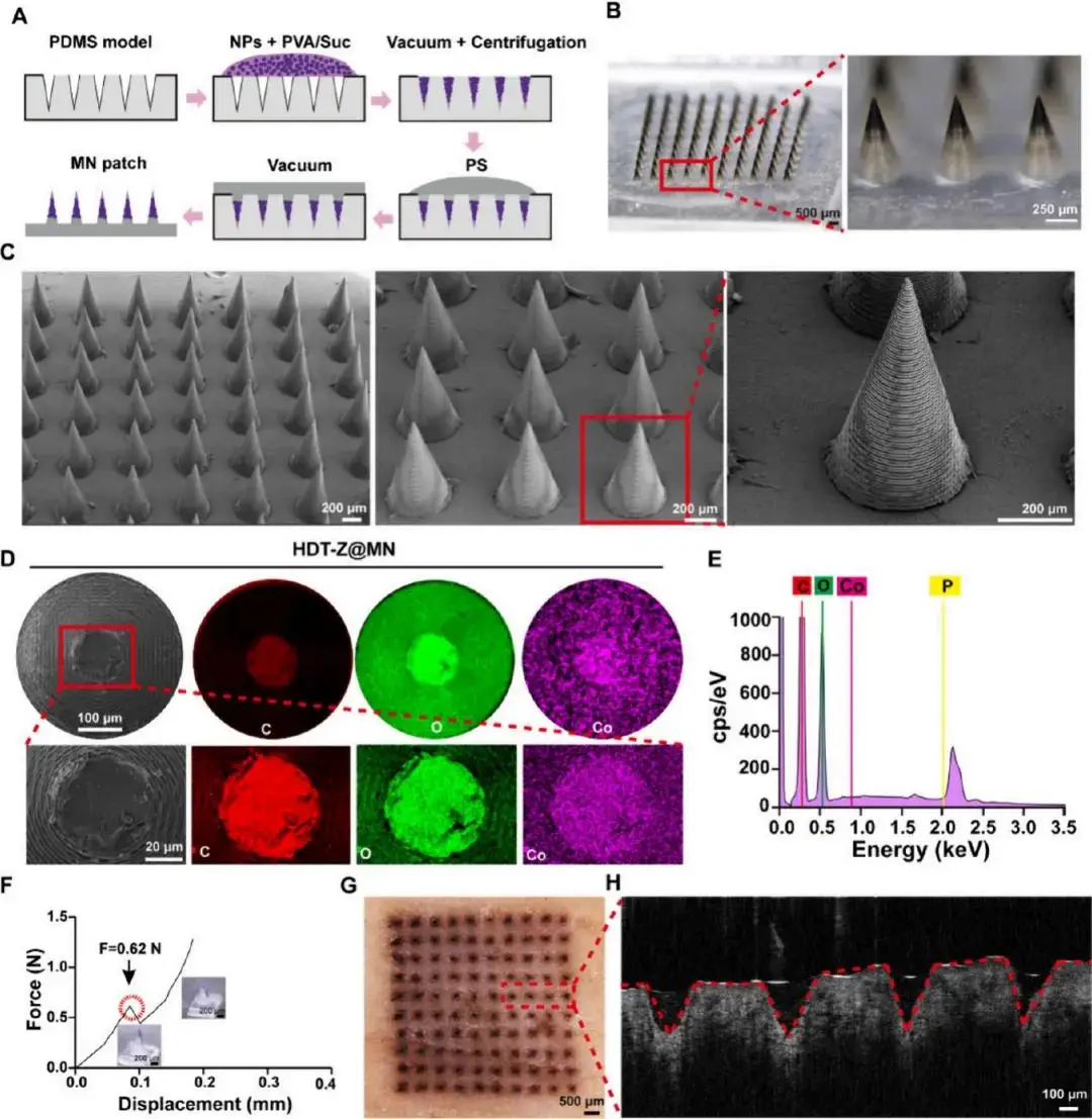 图:中空DOX-TPP@ZIF-67纳米颗粒负载纳米颗粒的表征,其中微针模具由摩方设备打印制备