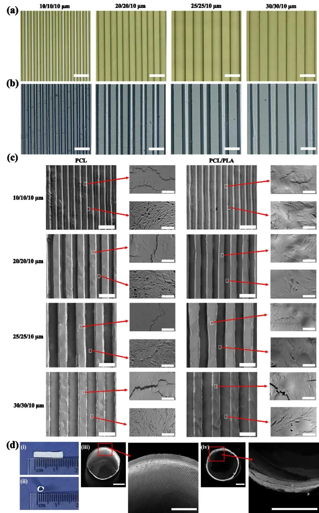 而在再生医学领域,曼彻斯特大学与南洋理工大学的研究者则利用摩方设备制造出带有微沟槽结构的神经导管。这一创新将神经导管的设计从“单一腔道”升级为“仿生多级拓扑”,为细胞生长提供物理-化学协同引导环境。沟槽仿佛为神经细胞修复搭建的“高速公路”,显著促进了雪旺细胞迁移和轴突的有序延伸。这意味着,未来周围神经损伤的患者有望通过这种仿生导管实现更高效的修复。