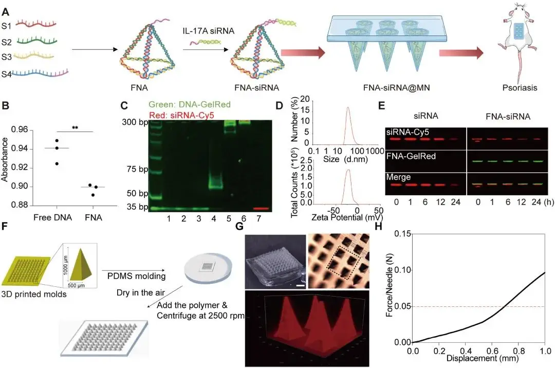 在免疫相关疾病中,微纳制造也展示了巨大潜力。银屑病是一种顽固的慢性皮肤病,传统治疗难以精确调控免疫反应。中国医学科学院的科研人员借助摩方设备制备的微针模具,将DNA纳米结构与药物递送系统结合,制成微针贴片,实现了在皮肤病灶处的精准治疗。这种策略不仅减轻了炎症,也显著改善了患者的生活质量。